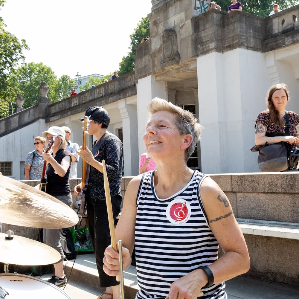 Jede Frau, die bei uns mitspielt, zahlt je nach Einkommenssituation einen Beitrag zwischen 10 und 25 Euro pro Monat. Zusammen haben wir Spaß an der Musik und miteinander: bei wöchentlichen Proben, zwei Probenwochenenden außerhalb von Berlin pro Jahr, Registerproben der verschiedenen Instrumentengruppen, Konzerten und bei zusätzlichen Workshops. Ganz nebenbei ist so ein wunderbares und tragfähiges Netzwerk von uns Frauen entstanden. 2023 hat der Verein sein 20jähriges Jubiläum gefeiert.